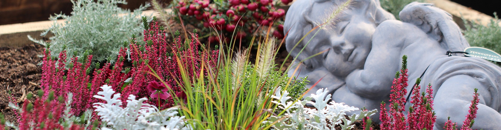 Zum Gedenktag zahlreiche Ideen für eine stilvolle Grabbepflanzung, Gestecke und bepflanzte Schalen. Mustergräber sind im Gartenmarkt aufgebaut.