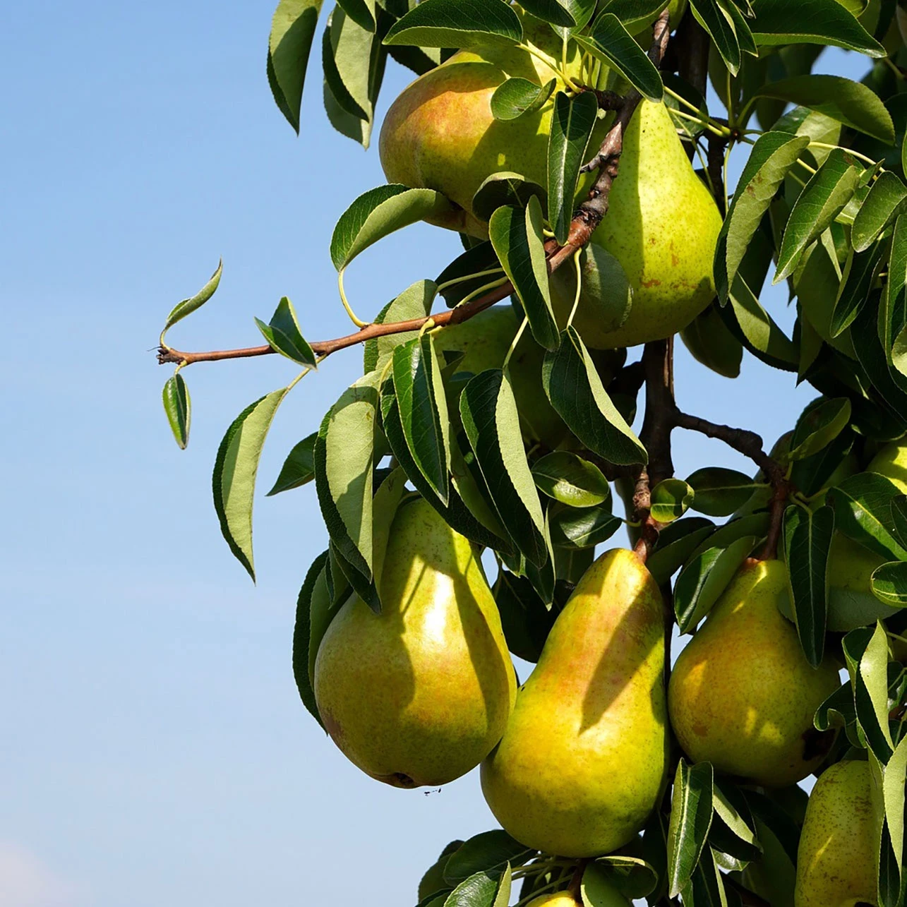 Zwei oder drei leckere Birnen-Sorten vereint. Leckere Birnen mit einer Erntezeit von August bis Oktober an nur einem Baum.